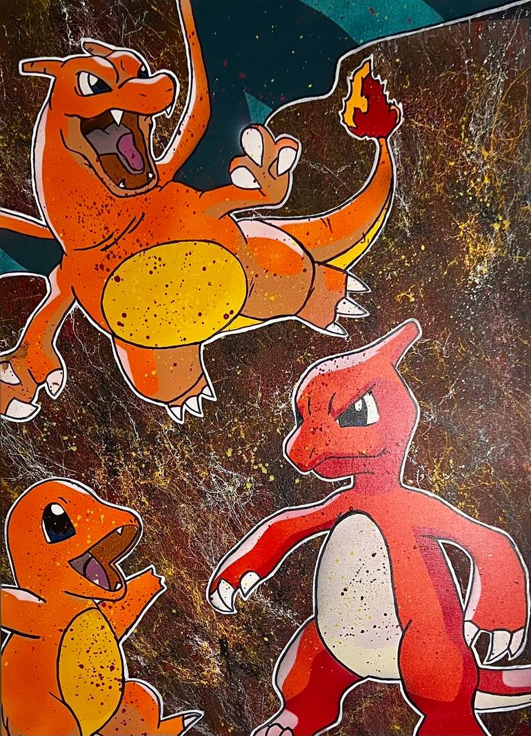 Il dipinto realizzato con la tecnica dello spray paint presenta Charizard, Charmander e Charmeleon in un'esplosione di colori dinamici e vibranti. L'opera trasmette un'energia intensa e una sensazione di avventura attraverso la combinazione unica di colori e texture.