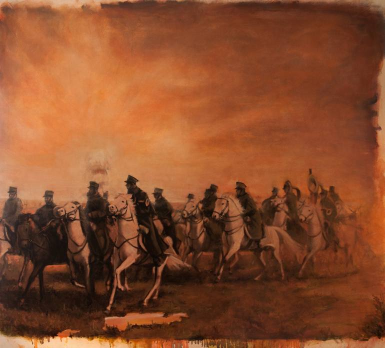 I find the legend of the Polish Cavalry charge against the actual documented evidence of the event interesting. I wished to portray the Polish Cavalry, not in their moment of defeat, but as a kind of ludicrous Romantic triumph. All the colors and the sky within the piece are taken from the videogame...