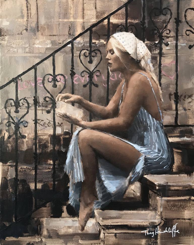 Tony’s painting is all about depicting the mood and intimacy within a moment, using a loose expressive approach to his brushwork creating spontaneity while carefully considering the placement of abstract alongside realism to create interest and the illusion of depth. He is particularly know for his take on abstract realism.