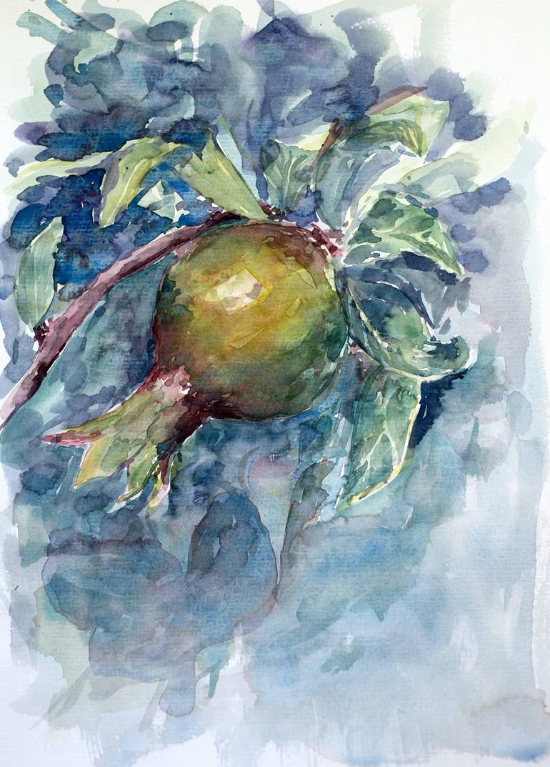 "Pomegranate Reverie" is a watercolor painting that captures the lush beauty of a pomegranate hanging from its branch. The vibrant green of the fruit contrasts beautifully with the deep, dreamy blues and purples of the background, creating a sense of depth and mystery. The interplay of light an...