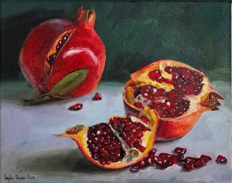 Pomegranate fluit on emerald green background still life original canvas oil painting, the fruit picture light and fresh. Is a perfect decoration for your home! Ideal for a bright interior, such as a bedroom or living room. The size is 10x12 inch. A nice gift for yourself and your loved ones! Painti...