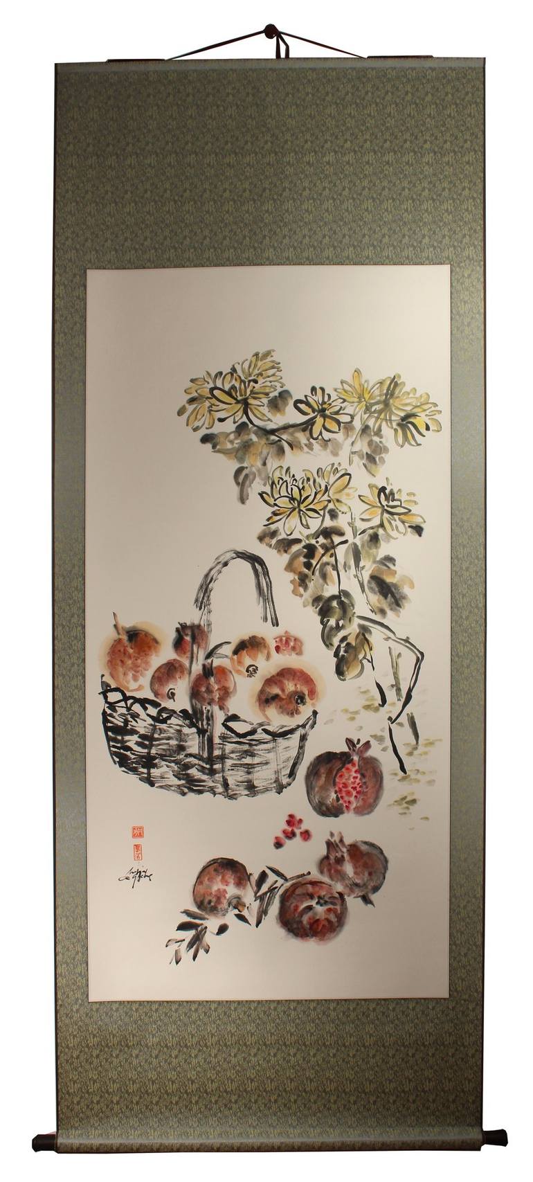 Watercolor Painting: Japanese and Chinese watercolors, ink and mineral pigments on rice paper. Pomegranates And Chrysanthemums Are In No Hurry Poetic fall still life, chrysanthemums and a basket with pomegranates, the lovely companions of autumn. This autumn still life is mounted as a scroll wi...