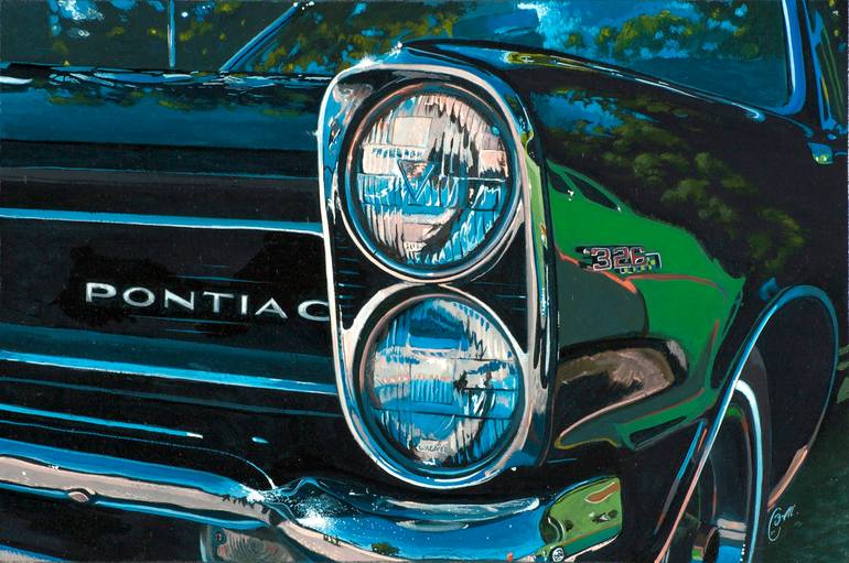 Pontiac 326 by Bryan David Snuffer. 18x24" acrylic on masonite. Enamel finish. Taking my daughter to a drive in was very fun as we got a chance to look at all the cars. When it came to creating some ideas for future paintings this Pontiac was a shoe in with its classic lines, deep black finish and t...