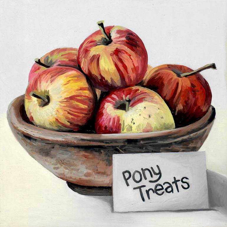 Every good pony deserves a sweet treat. This painting is a perfect reminder of why we love our horses. Fresh crisp apples painted in an earthen bowl with a cheerful note. A nice compliment to any equine collection or a perfect gift for a horse lover. • Unframed oil painting on cradled gessoboard....