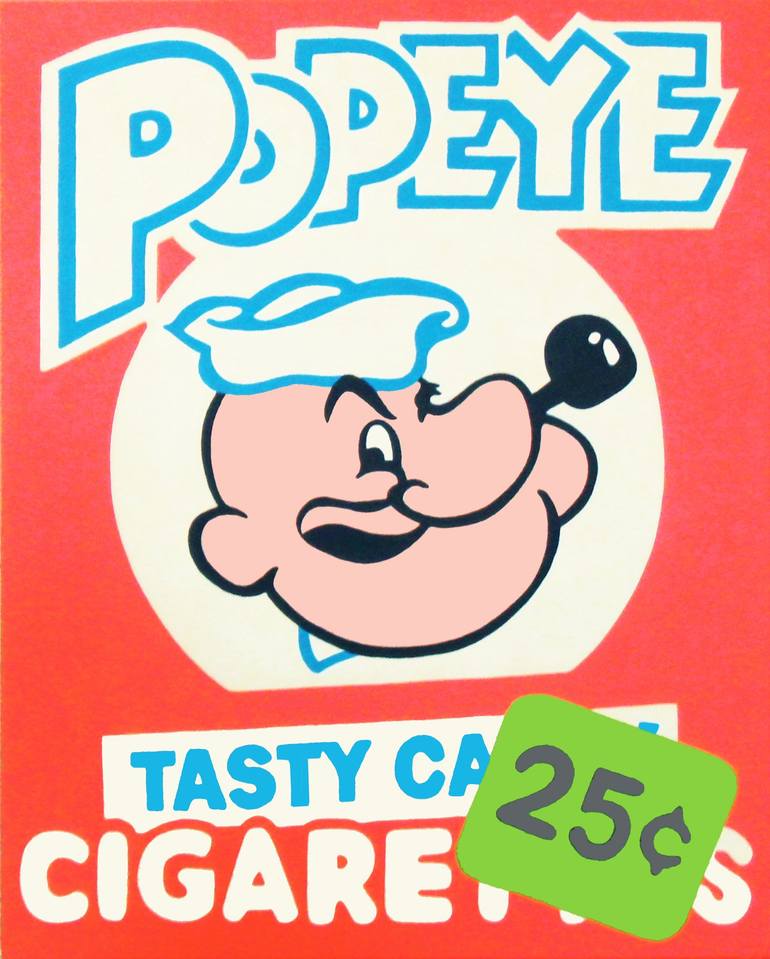 This delightful painting, "Pop Eye Candy 2 (USA)," is a modern, fine art piece inspired by the classic Popeye candy cigarette box. This is the artist's second version of this popular culture icon, this time featuring a nostalgic 25 cent price sticker, a charming nod to simpler times. The artist's m...