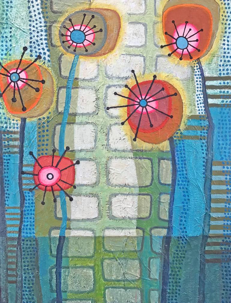 This acrylic painting is 34" x 26' and has a lot of texture. The edges are painted so you don't have to frame it unless you want to. I'm inspired by mid-century, design and style. I study1950's architecture, color palette, atomic patterns and fabrics. I love gardens, flowers, kaleidoscopes and trans...