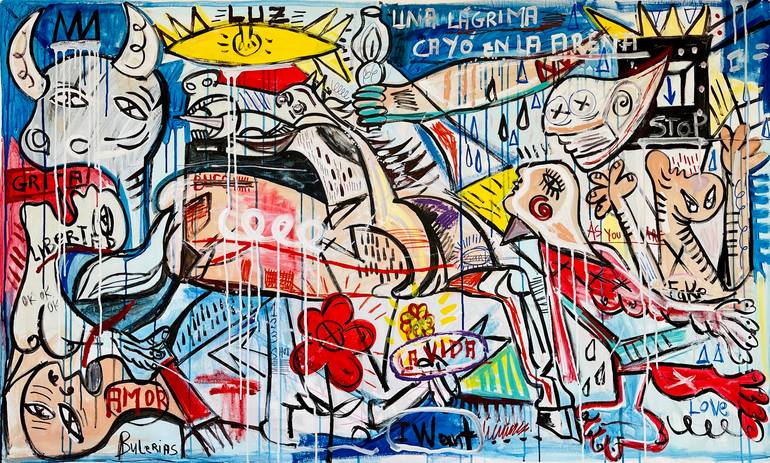 Pop version of the famous Picasso’ artwork Guernica. Unstretched. Extra canvas for stretching.