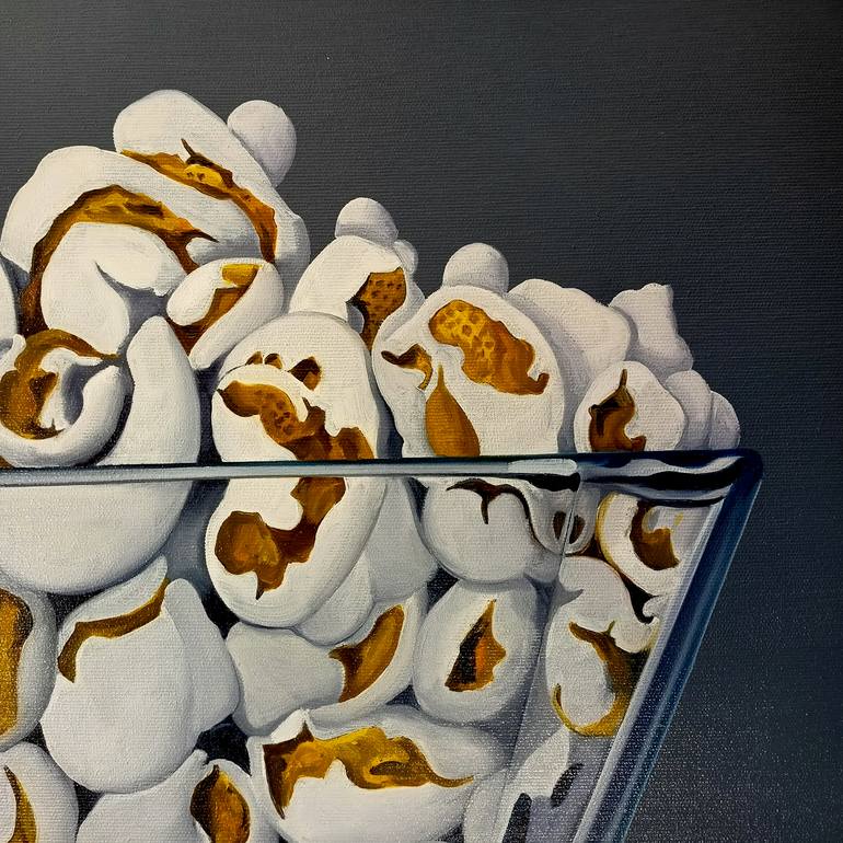 A glass bowl contains white popcorn. The white stands out in this painting, a soft, candid white that smells of inner peace. A relaxing and interior painting. The white elements are white clouds of peace.