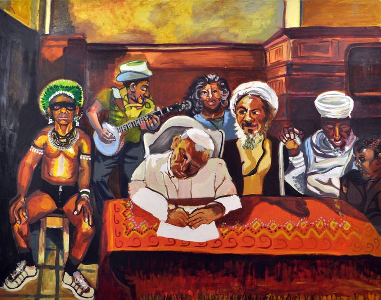A group of disparate Spiritual and Religious leaders gather together to draft a peace agreement. The composition and background are based on the Rembrandt painting, Syndic's of the Cloth Guild. Since Rembrandt often painted multi-figure paintings, I wanted to see how emulating his composition woul...