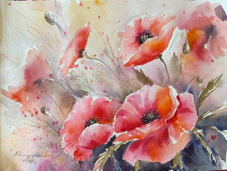 This painting, titled *"Poppies,"* captures the vibrant and captivating beauty of poppies at noon. It is part of a series dedicated to the depiction of flowers, inspired by the rich variety of colors and textures found in nature. The artist has used classic watercolor techniques, skillfully applying...