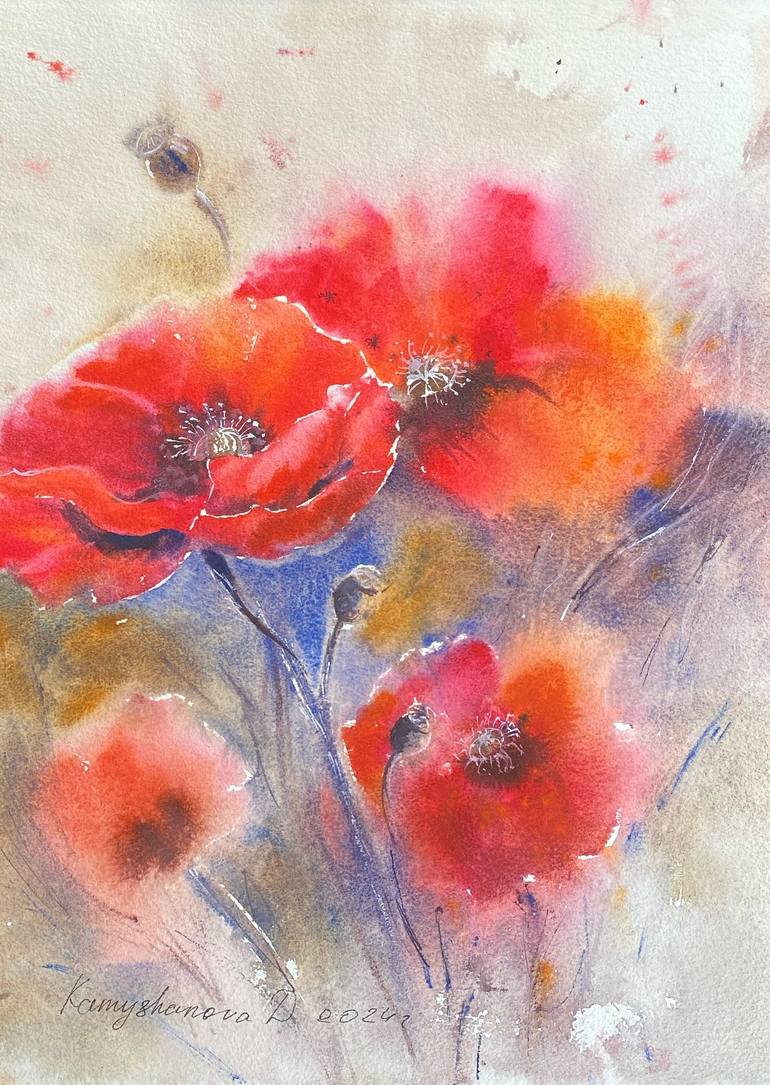 This painting, titled *"Poppies,"* showcases the vibrant red poppies in full bloom. It is part of a series of works that celebrate the beauty of flowers, inspired by the rich diversity of colors and textures in nature. The artist has used classic watercolor techniques, applying various shades to cap...