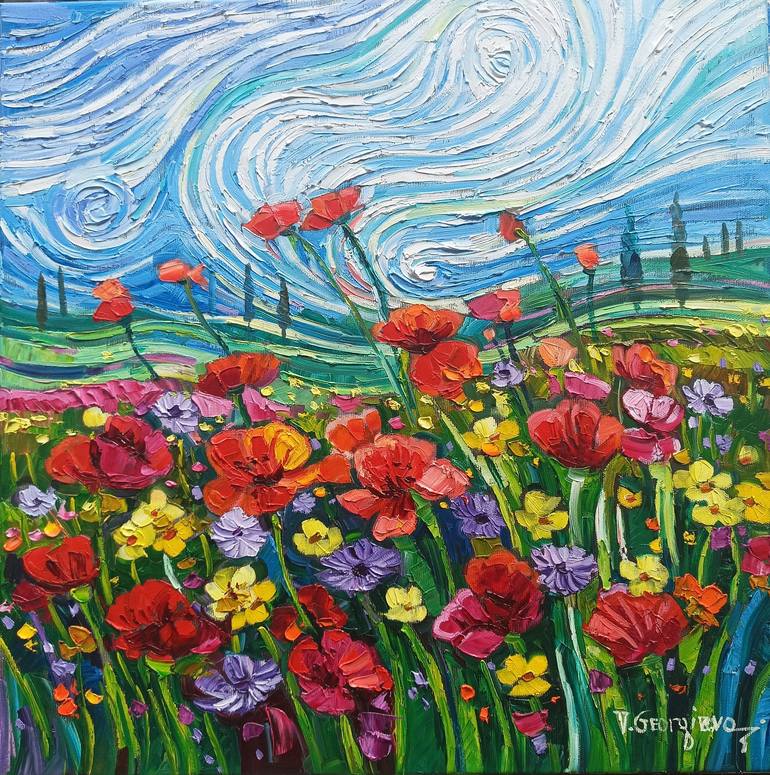 Extraordinary landscape with poppy and lavender fields...with lots of movement of the brushstroke. Sky soft, pastel colors