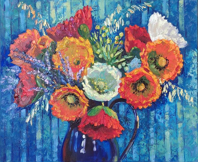 Palette knife painting. Oil on canvas. Stil life poppies.I really waited for poppies to grow in my garden and I could draw them In Persian culture, the scarlet flower was considered a symbol of joy and eternal love, and the wild field poppy hinted at the desire for a secret intimate relationship.