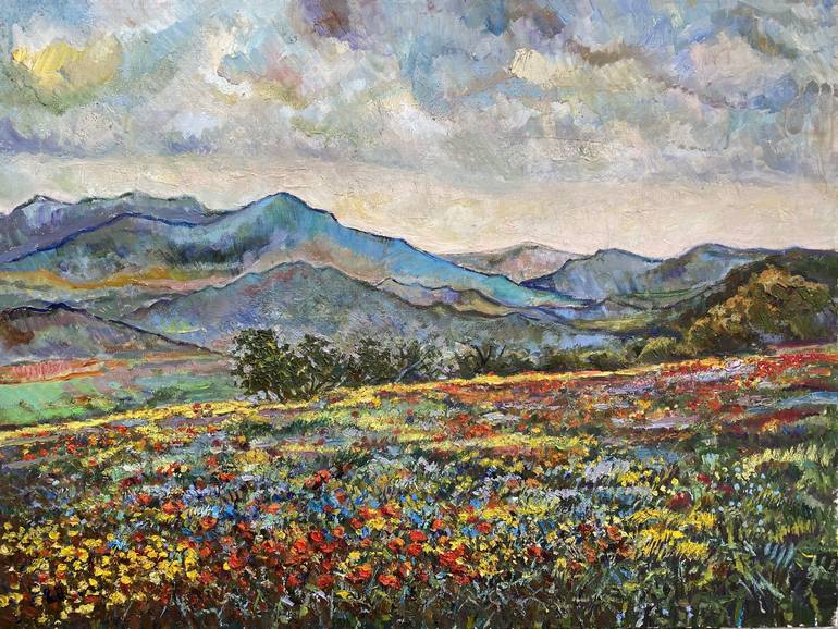 This is an original painting of the poppy field in the Georgian countryside. In June of 2016 our friends, my wife and I went for a hike and a picnic in the mountains. After a couple hours of hiking, we found that beautiful poppy field in the foot of the mountain range, and were about to proceed with...