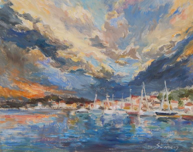 Monumental sky full of sun determines the character of the scene. The scene is turbulent and changing, just like nature itself.