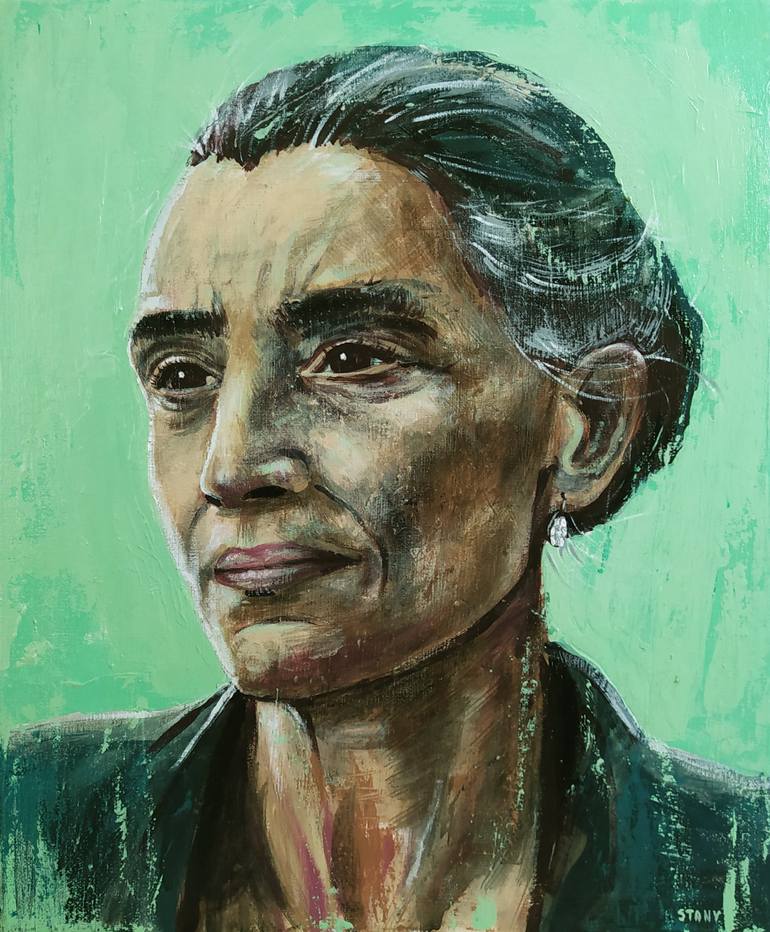 A portrait of an old woman, wrinkles, earrings and grizzled hair.