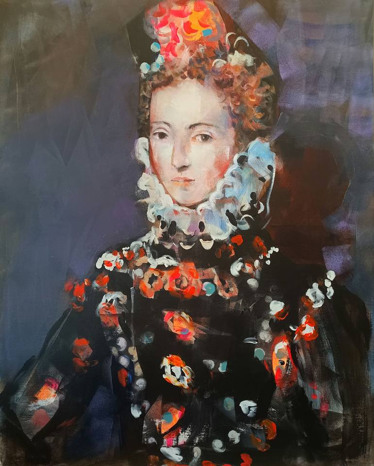 The fascinating portrait of ladys of the past empowered behind beatifull clothes and jewlery So marvelous look A portrait f a woman full of Life and strenght it is awesome for the artist to notice the diferents looks of the two sides of every face both the left and rigth seem to reflect sometimes pe...