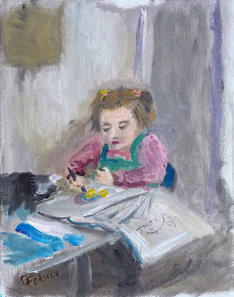 The painting depicts a girl who is drawing while sitting at a table