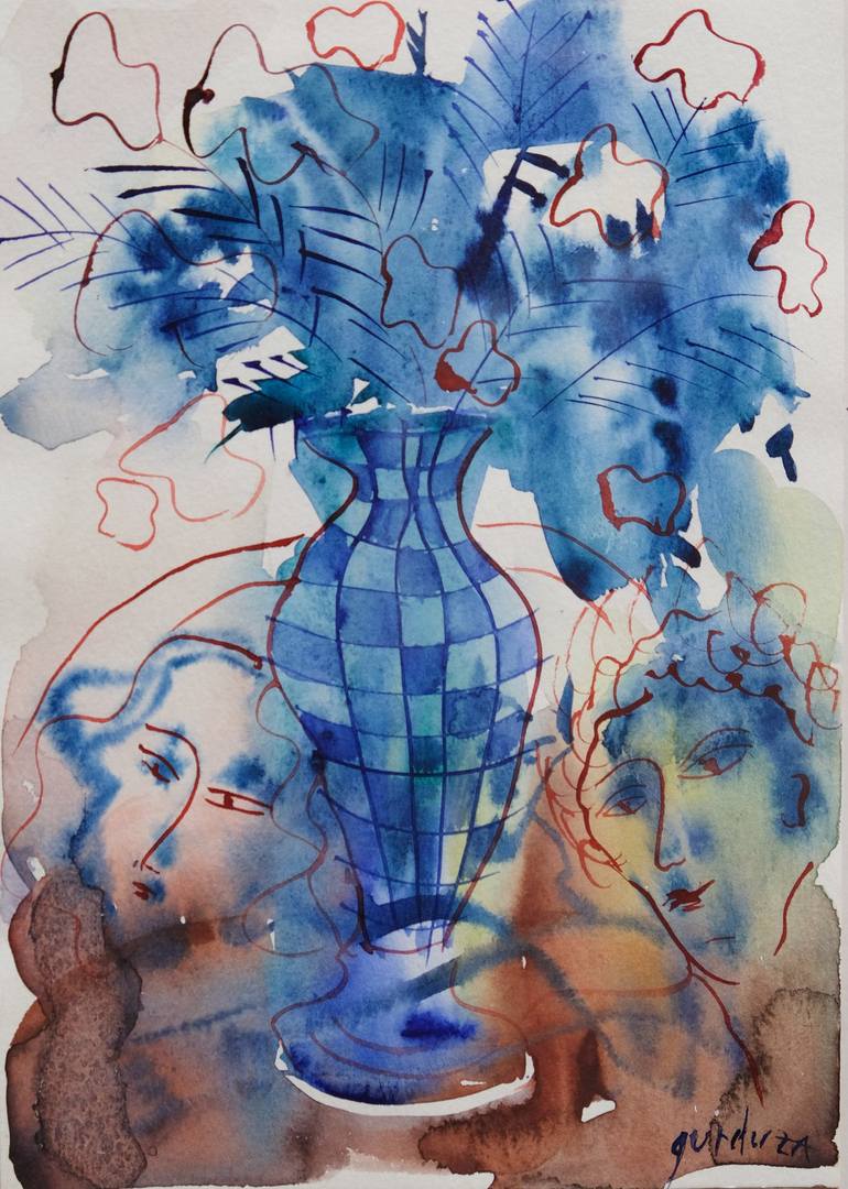 Original watercolour and pencil drawing on art paper, made from imagination and memory. The still life stays in front plan, forming a blue column that splits the lovers and unites them through the reds flowers in their spirits.