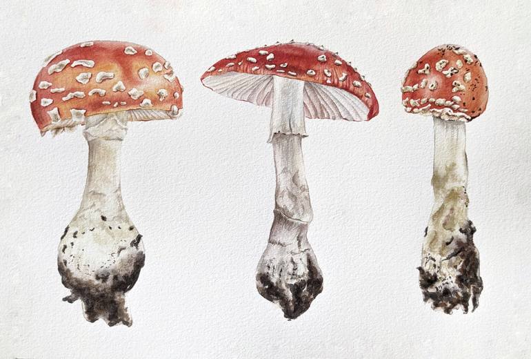 Botanical watercolor fly agaric. The composition consists of three different mushrooms, made in the technique of botanical watercolor. The size of the painting is 30 cm - 20 cm.