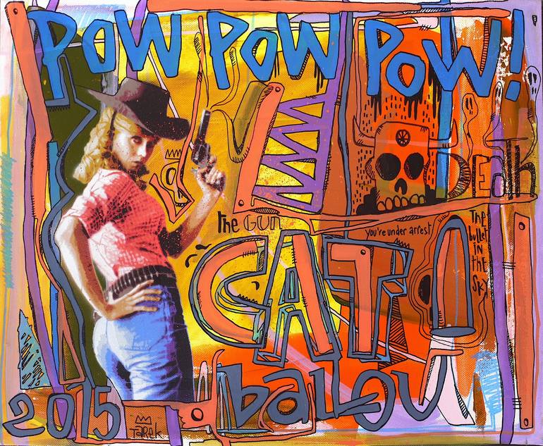 This vibrant and bold work, titled “Pow Pow Pow: Cat Ballou,” immediately draws in with its explosive fusion of bright colors and pop-art styles. The central figure, a stencil of Jane Fonda in cowboy attire by Mat Elbé, symbolizes strength and defiance. Around her, graphic patterns and bursts of tex...