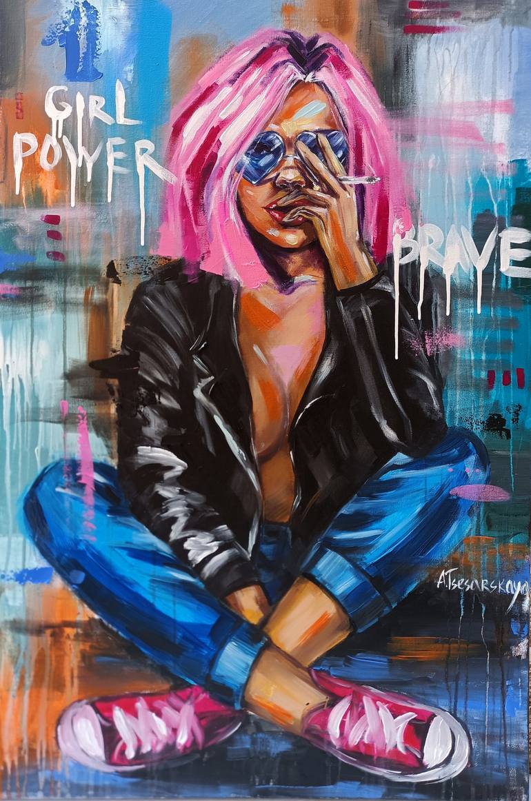 looking at this artwork with the young girl I want to be like her. Be independent and powerful, brave and free. This artwork represents the fight for equality and women's rights. About this work: it is sent in a tube with maximum protection of the artwork. -Colors: white,rose,red, violet, blue, yel...