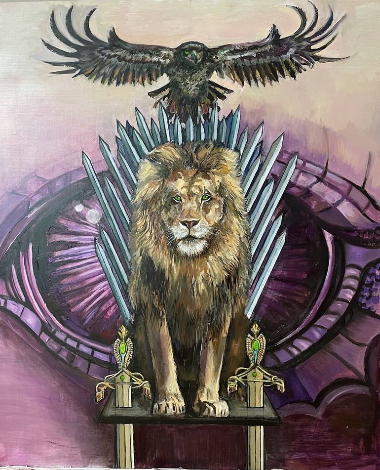 have created this composition to stimulate a powerful presence in the eye of the beholder. What else can invoke the intoxicating feelings of control, confidence and influence if not the alpha male of an animal kingdom sitting on a human-made throne, with an all-seeing Eye of a Dragon behind his bac...