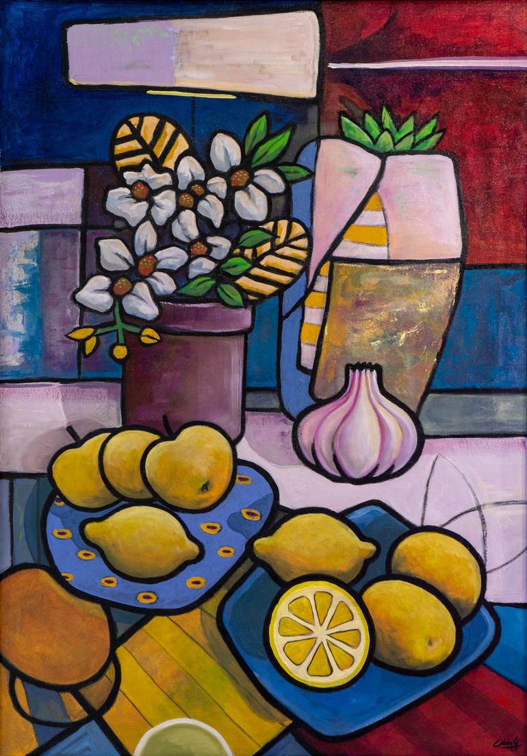 En esta pintura juego nuevamente a componer armónicamente utilizando el bodegón como excusa para la exploración estética. Equilibrios dinámicos junto con una paleta cromática intensa hacen de esta pintura una experiencia visual satisfactoria. Ha sido realizada sobre un lienzo fijado a una placa de ...