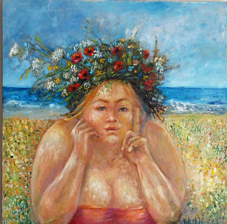 "Pretty Woman" is an original oil painting on canvas that captures a captivating woman adorned with a wildflower wreath. She reclines gracefully on the grass near the sea, her joyful presence radiating confidence and contentment. The artist's masterful use of oil paints brings warmth and depth to t...