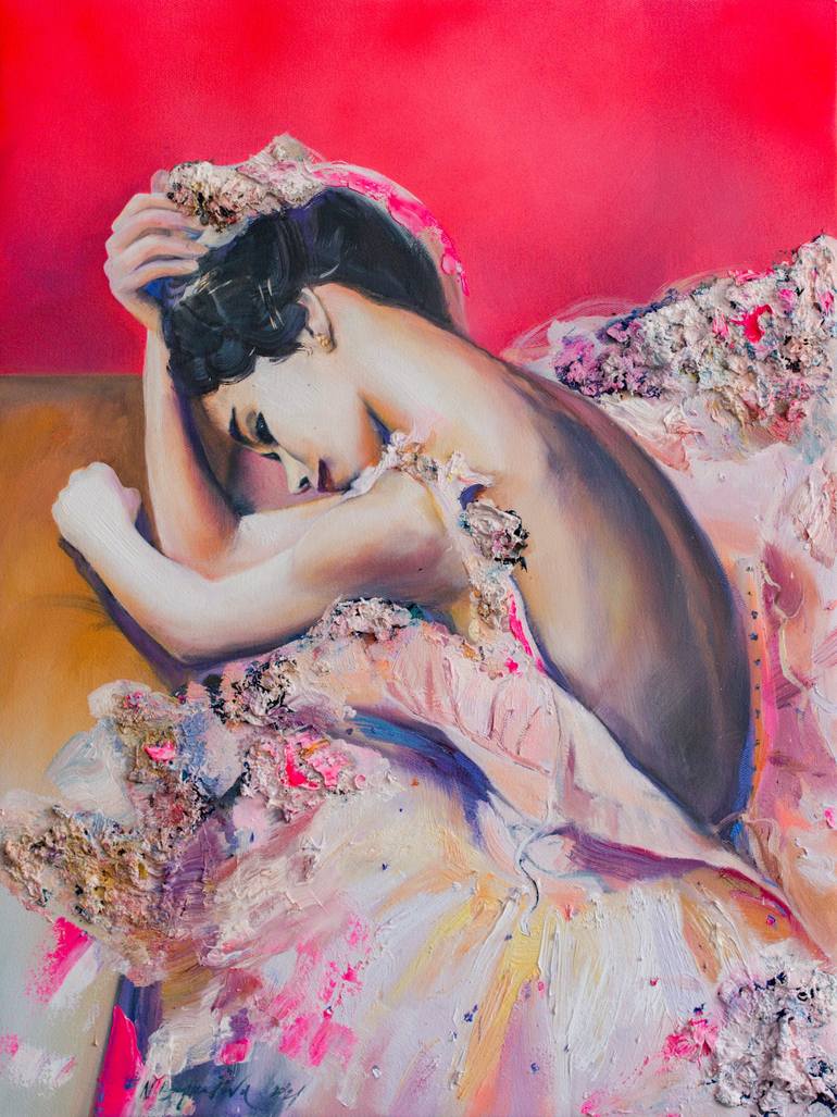 I think this is the moment after the show. She danced her part brilliantly. Tiredly takes off his hat and smiles. She is a ballerina and she is happy with the result. The other hand is clenched into a stubborn fist. Fragility and strength. Strength is in skill. The painting depicts the moment of awa...