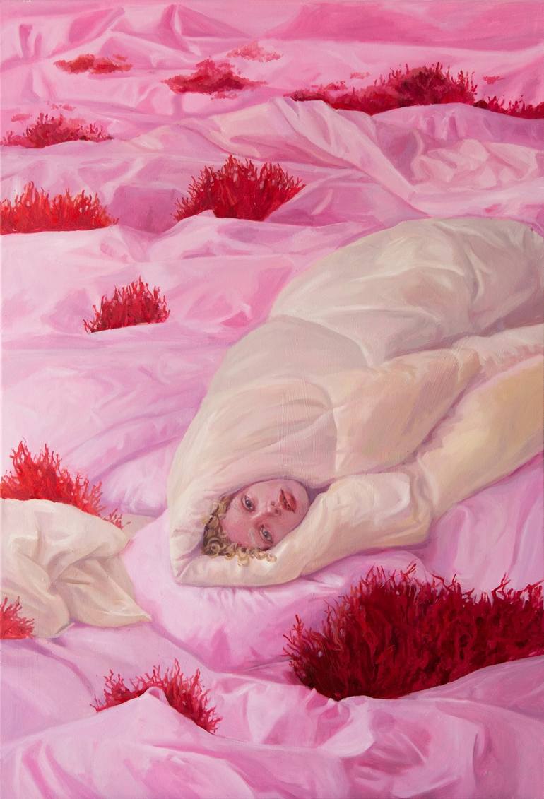 This painting was inspired by the fairy tale "The Princess and the Pea." She lives in her magical, soft world of rose-colored glasses, cotton candy, soap bubbles, and eternal peace.