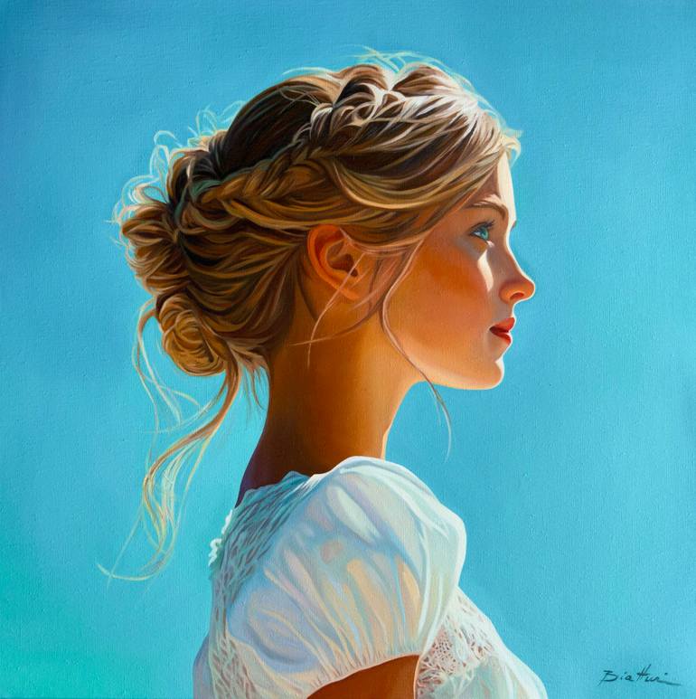 This painting is my way of welcoming spring. I wanted to capture that moment when the light changes, the air feels fresher, and everything seems full of possibility. The warm sunlight on her face, the soft breeze lifting a few strands of hair, the crisp blue sky—it all reflects the feeling of stepp...