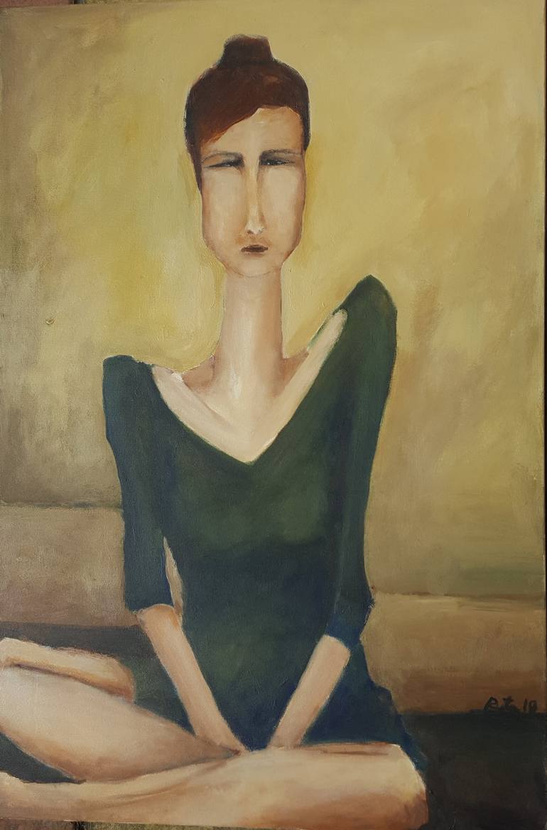 This portrait delves into the inner life of the subject. It presents a woman who is composed, self-assured, and possibly detached from external distractions. The painting invites the viewer to contemplate their own personal space and the importance of quiet reflection. The woman's elongated figure a...
