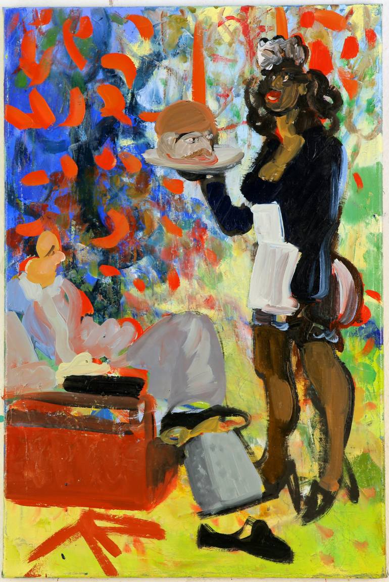 The white dud looks at the dark waitress as she serves a freshly cut off head on a tray. Balancing the unbalanced.