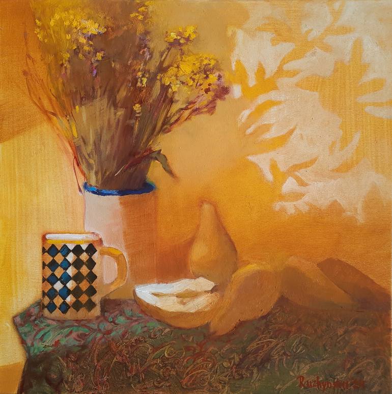 "Promise of Autumn" was inspired by the quiet beauty of seasonal transitions, particularly the way autumn light transforms simple, everyday objects into something deeply poetic. The dried flowers in the vase, the warm tones of the fruit, and the interplay of light and shadow all reflect a moment of ...