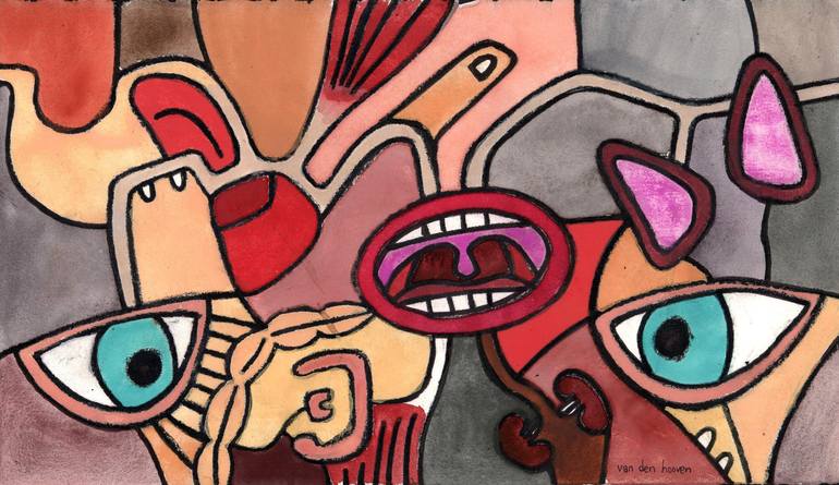This piece does not have any synthetic objects in it at all, only organic objects. The mouth takes centre stage here rather than the heart. And it’s an open mouth, screaming. This artwork also features a cadmium red heart, a pair of lungs, a pair of kidneys, two blue eyes, a large intestine, a stom...