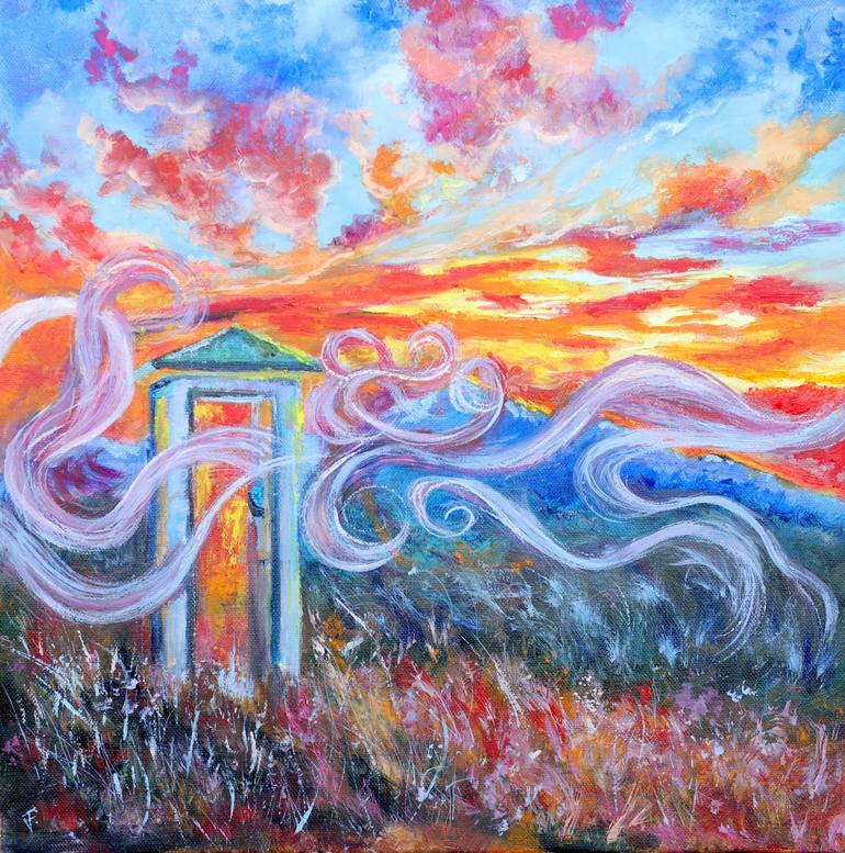 Public telephone booth on the Tuscany landscape at sunset original painting. The artwork is signed and varnished, it is ready to hang. Not framed. In this painting, I poured my soul into capturing the ethereal bridge between the physical and mystical realms. The vibrant, fiery skies merge with the s...