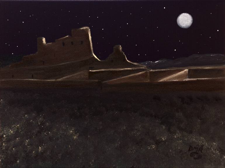 An original oil painting of the ruins, Pueblo de Salinas in moonlight