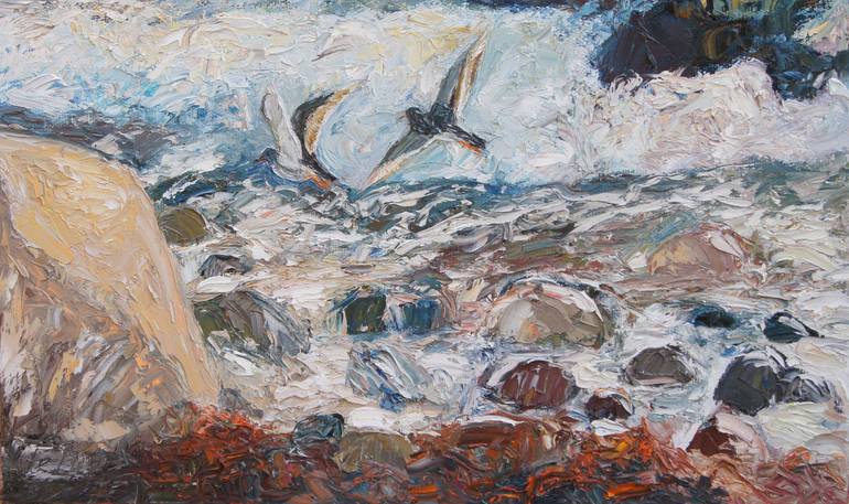 I observed and photographed the sandpipers from the snipe family one fall evening on the Danish Easter Island of Aeroe at the shore. I painted this picture in my studio in the spring of the following year. I applied the oil paint impasto with palette knives to make the graceful movement of the birds...
