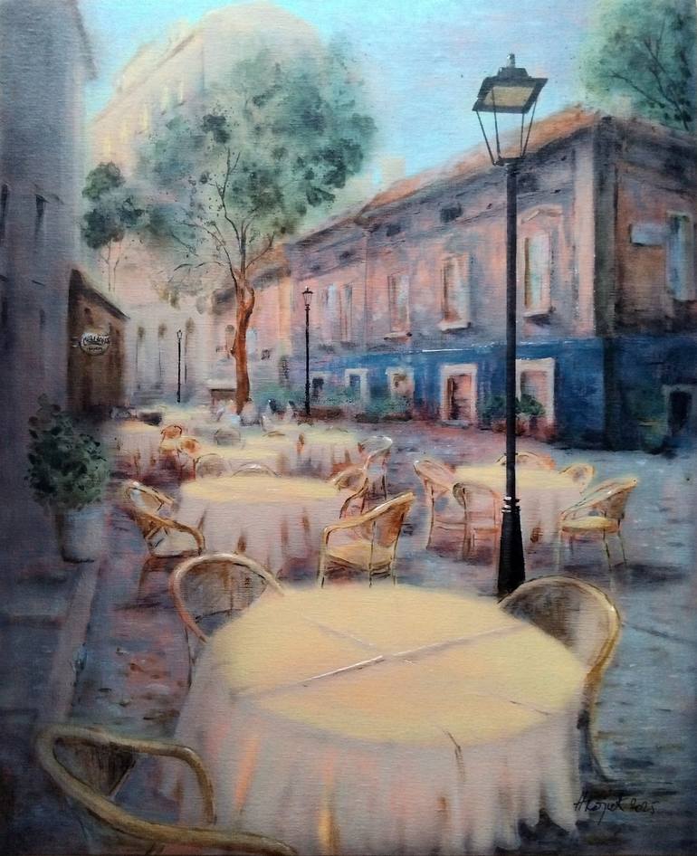This original acrylic and airbrush painting on canvas invites you into a peaceful outdoor café scene. Imagine quiet cobblestone streets lined with trees and historic buildings, where empty tables and wicker chairs await. The soft light creates gentle shadows, enhancing the serene atmosphere of this ...