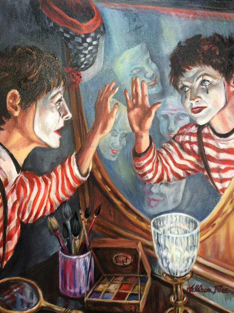 A clown looking in the mirror when putting on her makeup. She knows the show must go on therefore she must be at her best no matter how she really feels. Smiling faces are reflected in the mirror perhaps mocking her.