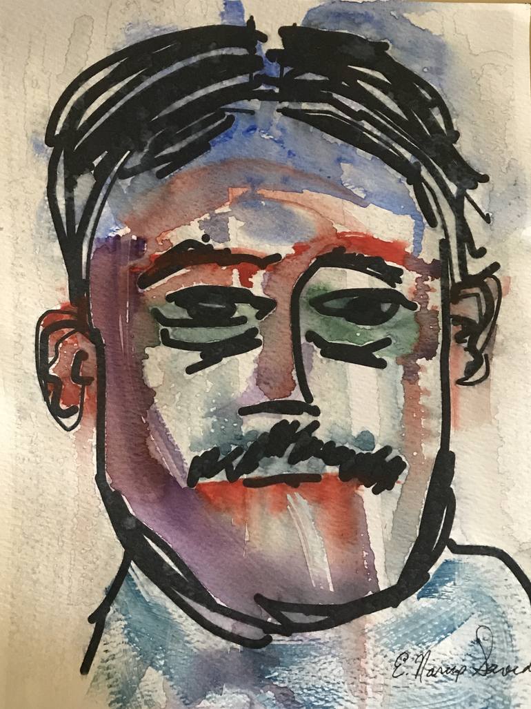 This watercolor is an expressionist portrait of Jacques Villon. (Gaston Duchamp) It is inspired by a photo of the three Duchamp brothers. Having studied their paintings, I decided to use their colors and styles. First I sketched his face on my I-pad, then printed it on watercolor paper. Last, I pain...