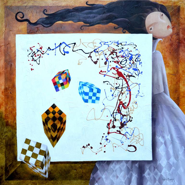 The painting "Puzzle" depicts a young woman gracefully holding a large masterpiece. The vibrant colors and intricate details of the masterpiece evoke a sense of awe and inspiration. The woman's expression is one of contentment and contemplation, as if she is lost in the beauty of the art. The paint...