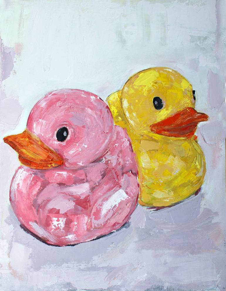 'Quack Attack' This piece uses absorbing colours in a balanced composition of two joyful ducks. A blend of light and medium textures on a neutral background. This piece is on canvas board and will require a frame. A white wood box frame is recommended depending on the room/environment.