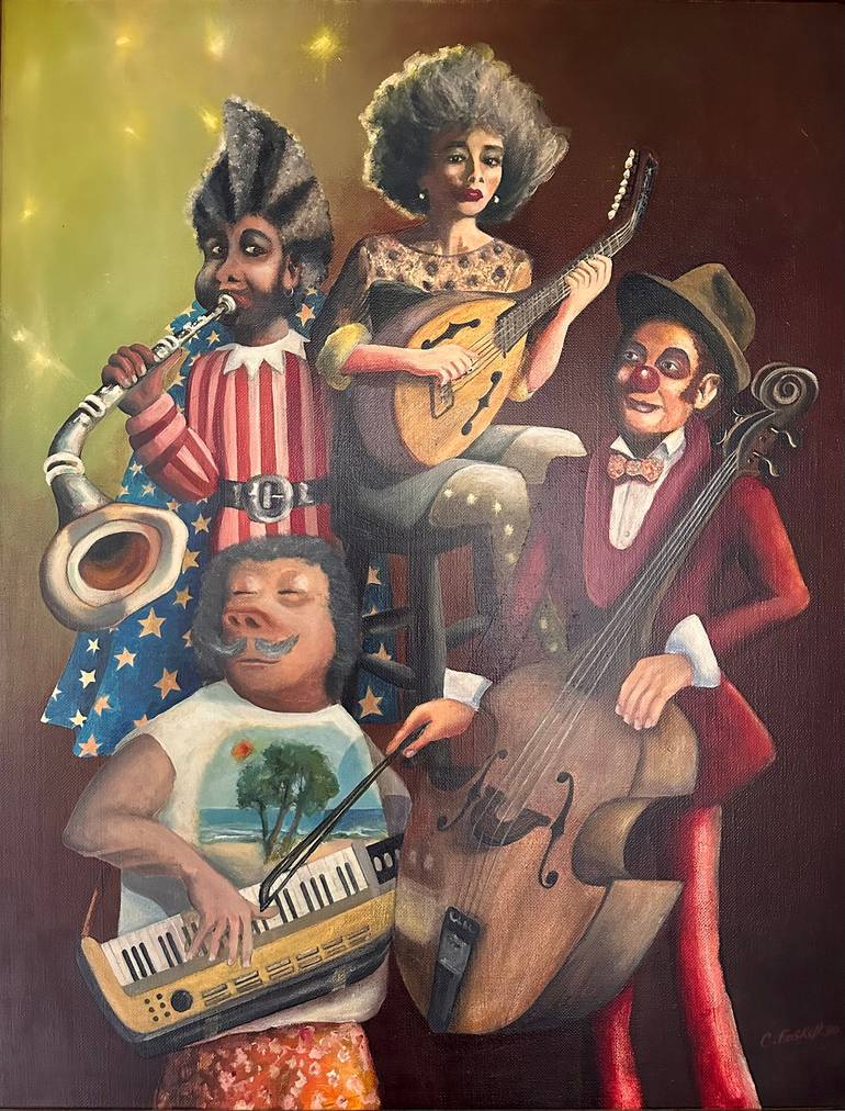 After touring the world as a musician and seeing just about every type of musical entertainer over many genres, I felt a strong need to create a painting that displayed four very colourful characters. In cartoon style, these four characters portray everything from folk music, soul music, progressiv...
