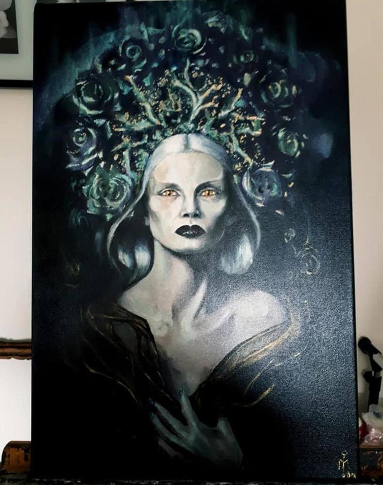 Esther, also known as Black Meridians, is creating (un)earthly expressions on Canvas and forges it in Solid Matter since childhood. Fascinated by the darker aspects of the old masters that are held to the light of modern times and fascinated by the sometimes sinister figures that well up from the subconscious mind she paved way in artcrafts like drawing, writing, painting and sculpturing. Elements from ancient cultures like Greece and Egypt, Asia and Africa are often surfacing and revived combined with inhuman characteristics. As she is triggered by archetypes that are constantly causing her to mutate and transform her creations into new forms of an ethereal sovereignty and which often are of a Dark and Sultry ambiance, she uses high quality attributes like for instance gemstones and taxidermic supplies for her sculptures. Her paintings are often finished with bronze, brass, copper or gold pigmented paints to express the richness of autonomic life. As for her person: She uses these forms of art as a means of initiation. This results in artforms that won’t be and cannot be repeated or recreated. Each piece is therefore unique and singular in its presence and has been part of her personal transformation as she walks the initiatory Left Hand Path and ventures out on the road of Neomythology. (Taking certain mythological or fantasy figures as a means to integrate several aspects of their being into the personality in such way that it becomes functional and effective when applied to real life.) This has resulted too into the writing of several Grimoires like the quite recent APEX 218 (2020-2021) and Black Sun Imperium (2019) as some Sci Fi books The keyword is “Manifestation”. She writes: “When we execute rituals, crafting artforms in the mind, perform psychodrama, but its effect will not manifest on the physical plane, than it is an exercize in futility. The subconsciousness is so much more powerful. Even more than we are willing or daring to admit, but on the end it is this thing that will direct the course of our life. If you are unaware of it, than you will call it destiny or fate. You have to explore and to channel it for attempting to kick it back into the curb will only result in detrimental manifestations that can often be quite bizarre and most often, harmful.” It is therefore no wonder she was intrigued and inspired when reading the material of for instance; Karl Jung, Edgar Allen Poe, Maslow, Gurdjieff, H.P.