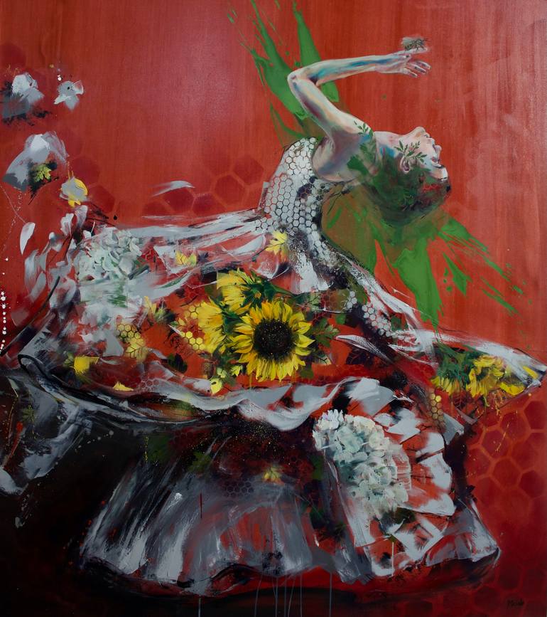 In 'Queen Bee 2,' my artwork captures the essence of femininity intertwined with the poetry of nature. A female character, enveloped in a halo of vibrant yellow sunflowers against a fiery red background, holds a bee in her hand. The scene draws inspiration from my journey to the south of France, whe...