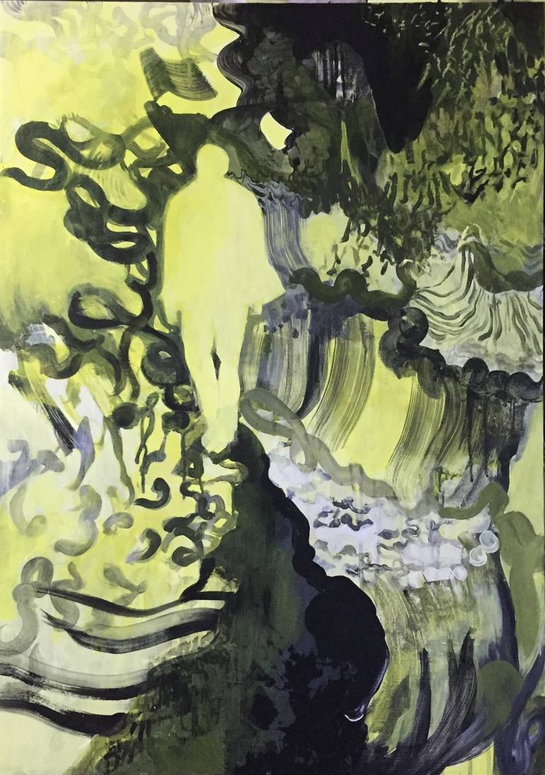 Painting on MDF panel Inspired by Arabic calligraphy and abstract expressionists Mark Tobey and Janet Sobel, my aim was to explore a vocabulary of lines and develop a graphic tapestry separating the viewer from the yellow ground.