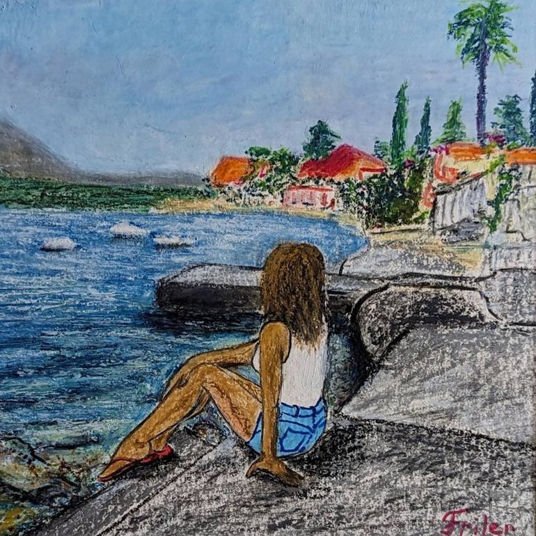 Quiet Bight captures a moment of stillness by the sea. A seated female figure looks toward the calm water and distant coastline, becoming part of the landscape itself. The scene conveys silence, warmth, and a sense of pause — a quiet summer breath. Created during the Montenegro series, the work ref...