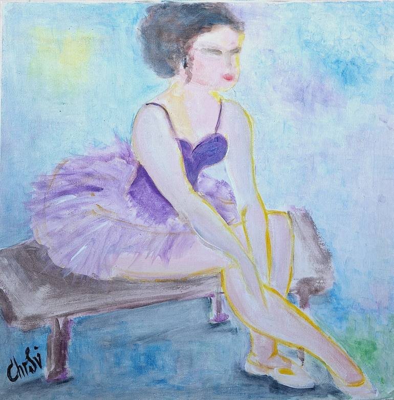This 50x50 cm oil painting on canvas, framed, captures the serene elegance of a ballerina in repose. The ballerina, depicted in soft pastels, sits gracefully on a wooden bench with her legs crossed, reflecting a moment of quiet contemplation after a performance. Her tutu, rendered in gentle shades o...